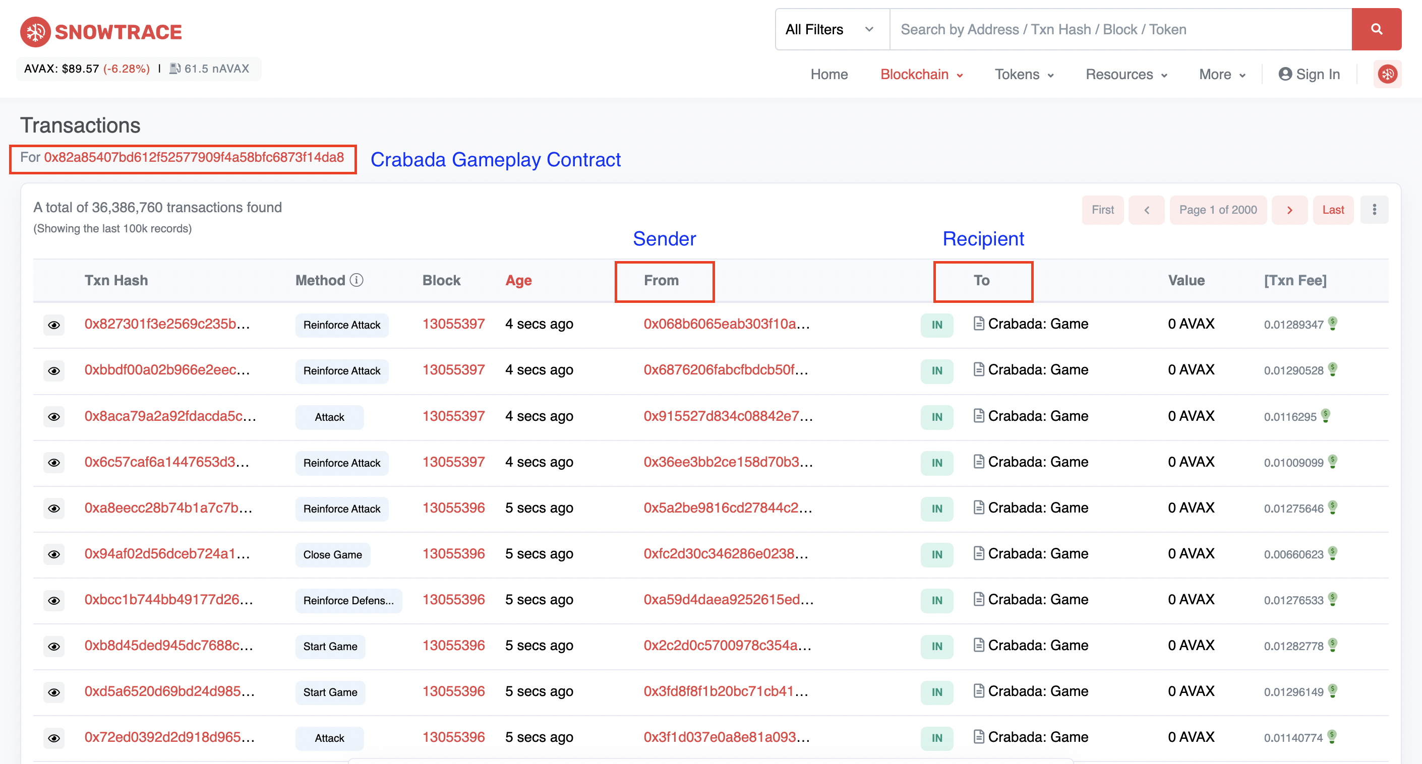 Our goal is to transform this query into one that measures a projects stickiness ratio - daily active users/monthly active users (DAU/MAU). The stickiness ratio is calculated by dividing the total active addresses in a month by the average number of daily active addresses. To do so you need to query the unique addresses in the tx_sender column where the tx_recipient is the Crabada: Game contract. As you can see in the image below, the Crabada: Game contract is always the recipient for in game transactions (to column).