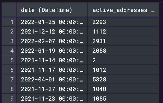 However, we want to aggregate the date column by month and find the average number of daily active addresses. To do this you must turn the SQL above into a subquery - a query that lives within another query.